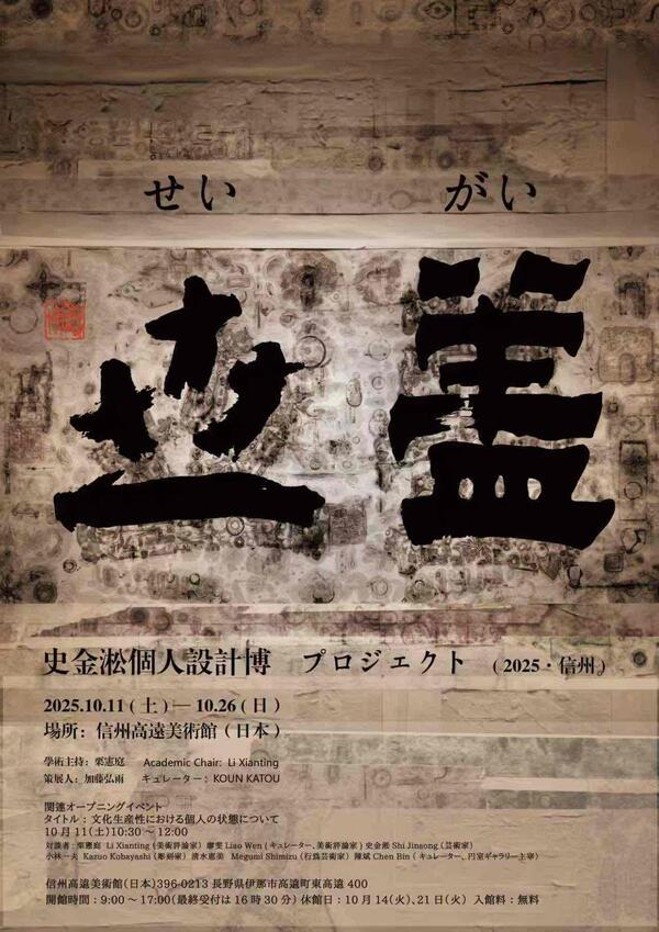 【伊那市】世蓋―史金淞個人設計博プロジェクト 伊那市 2025.10.112025.10.20 開催期間 2025年10月11日 - 2025年10月26日 09:00 - 17:00 Add To Calendar Download ICS Google Calendar iCalendar Office 365 Outlook Liveイベントタイプ 伊那市文化・アート円室ギャラリー企画展「世蓋―史金淞個人設計博プロジェクト」中国の芸術家・史金淞による個展。空間と記憶をテーマにした現代アートが円室ギャラリーに登場。開催日 2025年10月11日(土)~10月26日(日) ※休館日:11月14日(火)、11月21日(火)会場 伊那市 円室ギャラリー(第一展示室・第二展示室)開館時間 9:00~17:00(最終入館16:30)入館料 無料▶ 詳細をウォッチ!!