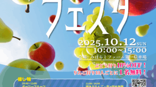 お祭り・フェスティバル【伊那市】みはらしファーム 秋のフルーツフェスタ 秋のフルーツフェスタみはらしファームの旬のりんご・梨・ぶどうを楽しむ収穫祭!限定ぶどうや特製スイーツも登場。開催日 2025年10月12日(日)10:00~15:00会場 みはらしファーム 第一駐車場出店 りんご・梨・ぶどう、特製ジュース、... 2025.10.12お祭り・フェスティバル伊那市食